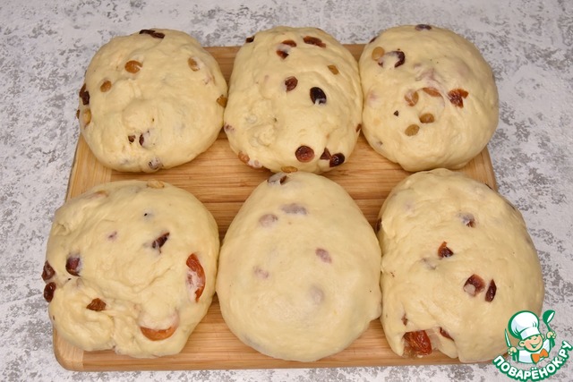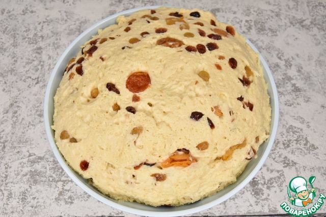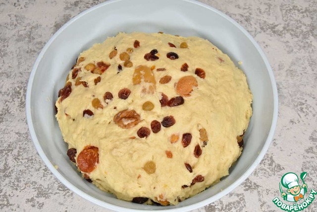 Когда все сухофрукты равномерно распределятся по тесту, подкатать его в шар, переложить в миску и снова убрать в теплое место до увеличения в объеме.