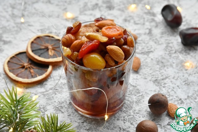 Вы можете выбрать все что любите (курага, изюм, вяленая вишня, клюква, чернослив, финики, инжир, цукаты, фундук, миндаль и. т. д.)