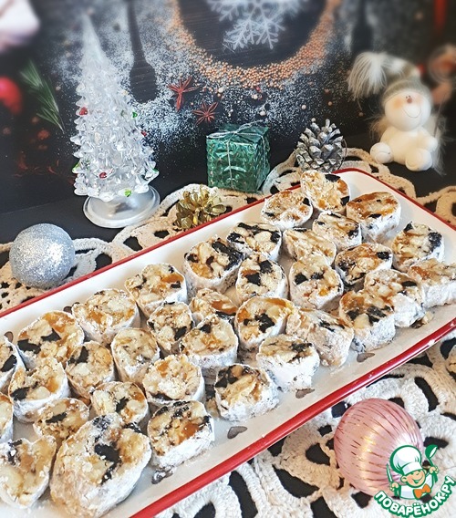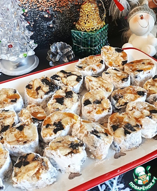 Смешать в одной миске подготовленные ранее печенье, курагу, чернослив, орехи и масло с белым шоколадом, все хорошо перемешать.