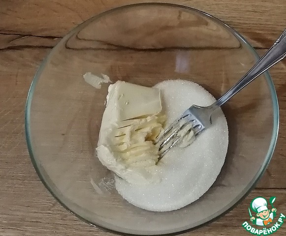 Сливочное масло заранее достать из холодильника, чтобы оно размягчилось. Соединить его в миске с сахаром. Тщательно перемешать.
