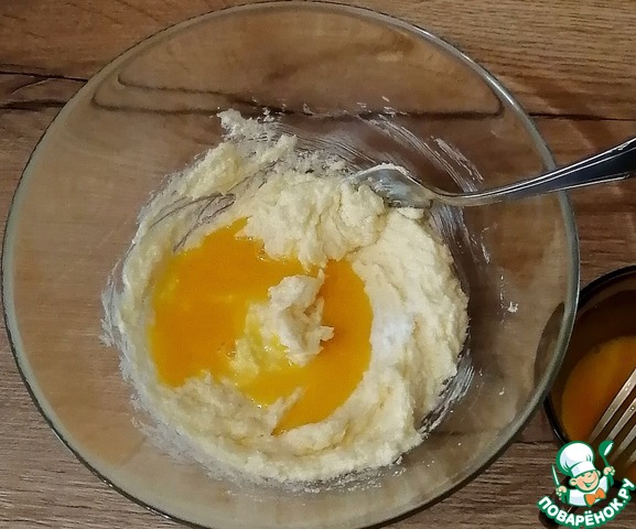 Муку просеять и смешать с разрыхлителем. Добавить в масляную смесь. Аккуратно смешать лопаткой.