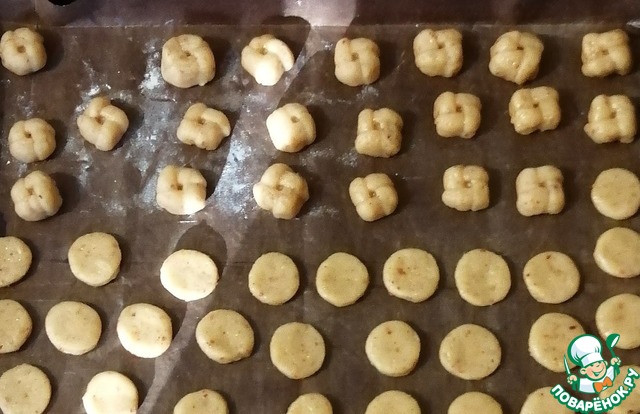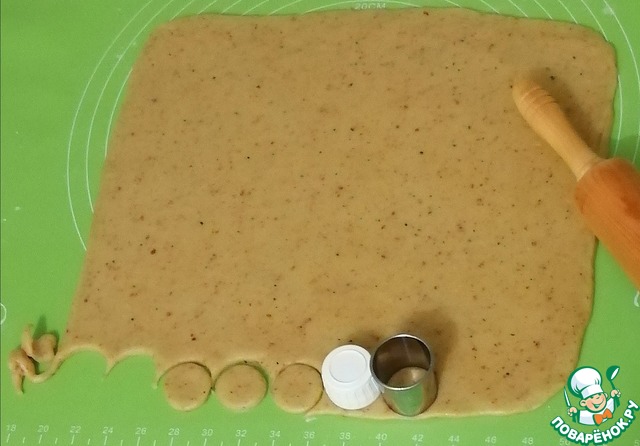 Раскатать в пласт толщиной 4 - 5 мм. Формочкой вырезать печенье. Если нет формы маленького диаметра, можно воспользоваться крышкой от бутылки.