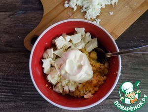Центральная закуска новогоднего стола такого уютного по-домашнему...! Незатейливая острая закуска готовится быстро, просто и из самых простых и доступных продуктов: вареных яиц, плавленного сыра с чесноком. Я добавлю сегодня своего в этот салат - сладкую кукурузу.