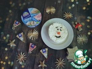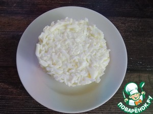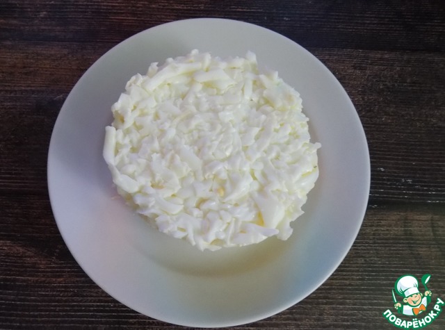 Я выложу салат в кольцо и украшу его рожицей снеговика. Белки нужно натереть на тёрке. Онм будут верхним белым слоем.