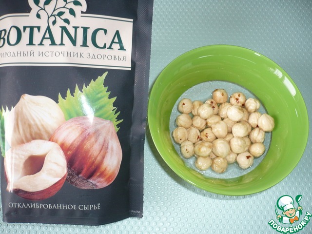 Фундук выложить на противень, обжарить в духовке 15 минут при температуре 90 градусов. Высыпать на полотенце и очистить орехи от шелухи.