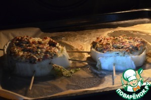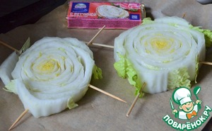 Нарезать капусту на порции, для того чтоб не развалилась, проткните капусту двумя шпажками. Поместить на лист пергамента или на фольгу. Посолить. -