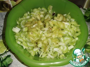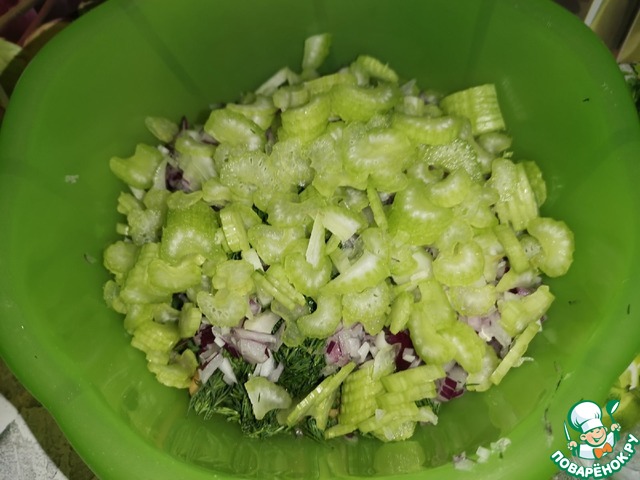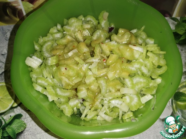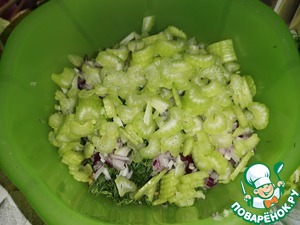 Заправить салат и убрать минут на 5-10 в холодильник, чтобы все составляющие салата подружились между собой.