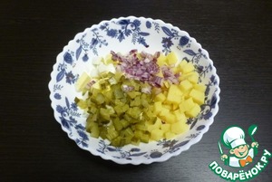 Маринованный огурец и сладкий лук нарезать мелким кубиком.