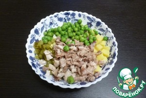 Куриное мясо нарезать мелким кубиком и добавить в остальную нарезку вместе с горошком. -