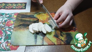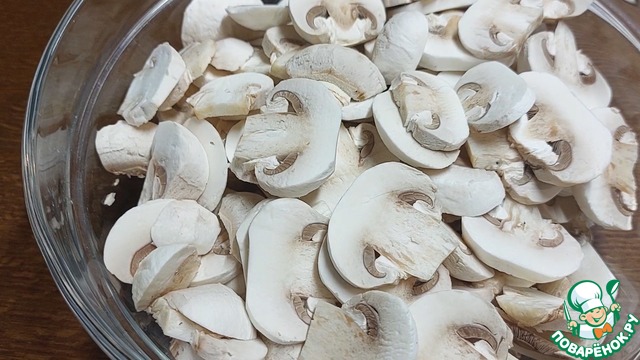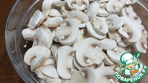 В первую очередь подготовим грибы, а именно шампиньоны. Их нужно вымыть, высушить и почистить. Так как шампиньоны у меня маленькие, я нарезала их пластиночками среднего размера. Сильно мельчить не нужно, так как в процессе обжаривания они еще уменьшатся. Две средних луковицы также чистим и нарезаем полукольцами.