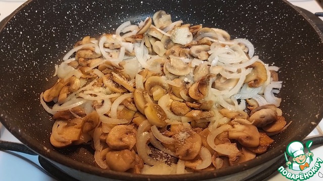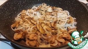 Обжарить грибы мне нужно так, чтобы образовалось золотистая корочка. Поэтому, предварительно хорошо нагреваю сковороду с маслом и, не убавляя огонь, отправляю туда грибы. На таком же большом огне обжариваем их, постоянно помешивая. Как только грибы будут готовы примерно наполовину, добавляем лук, убавляем огонь и продолжаем готовить. Спустя две-три минуты грибы с луком подсолите и продолжайте обжаривать до готовности.