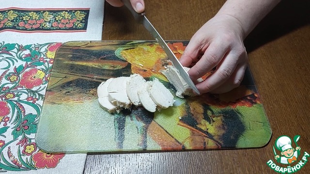 Куриную грудку я отварила в подсоленной воде. Сначала нарезаю её пластинками, а затем небольшими брусочками. Огурец моем и нарезаем также небольшими брусочками. Морковь по-корейски можно использовать готовую, а можно сделать самим.