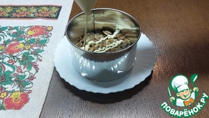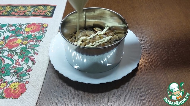 Собирать салат буду в кольце высотой 7 см, диаметром 12 см. Смазываем тарелку небольшим количеством майонеза и первым слоем выкладываем обжаренные грибы с луком. Аккуратненько разравниваем и сильно не прижимаем. Сверху покрываем майонезной сеточкой.
