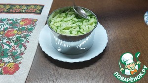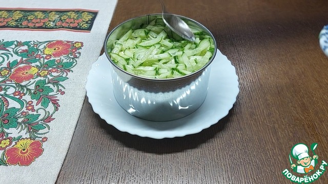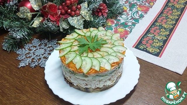 Следующим слоем выкладываем куриное филе и также покрываем майонезной сеточкой. Дальше выкладываем порезанный брусочками огурец, покрываем сеточкой и поверх выкладываем корейскую морковку. Аккуратненько все прижимаем, но не сильно.
