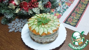 Накрываем кольцо с салатом пищевой плёнкой и отправляем в холодильник. Снимать кольцо и украшать салат будем незадолго до прихода гостей. Количество ингредиентов, указанное в описании, рассчитано на вот такую небольшую порцию. Для того, чтобы приготовить салат побольше, увеличить их количество вдвое.