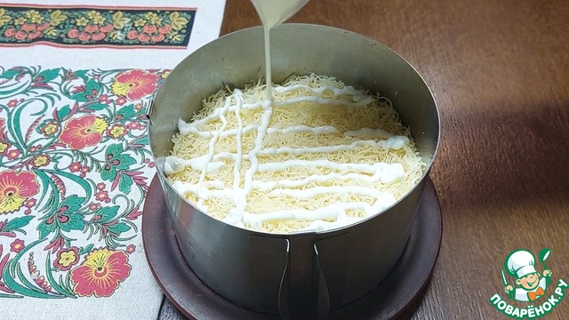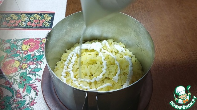 • Собирать салат буду в разъемным кольце диаметром 16 сантиметров. Можно это сделать в форме "горки". Картофель натираем на крупной терке и выкладываем первым слоем. Можно натирать сразу прямо в форму. Когда будете выравнивать картофельный слой, не прижимайте слишком сильно, чтобы сохранялась некоторая воздушность, салат не был сильно спрессован. Далее делаем майонезную сеточку. И, хочу забежать наперёд, слои с картофелем и сыром промазываем намного лучше чем остальные, так как это не самые сочные продукты.