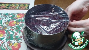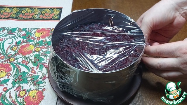 • Далее- натертый на мелкой терке сыр и снова сеточка. Как и картофель, свеклу натираем на крупной терке и укладываем последним завершающим слоем. Этот слой разравниваем и слегка прижимаем, для того, чтобы нанести рисунок. Если наличие ровных полосочек на рисунке не принципиально, то и этот слой можно не уплотнять. Накрываем кольцо пищевой плёнкой и отправляем в холодильник. Украшать салат будем незадолго до прихода гостей.