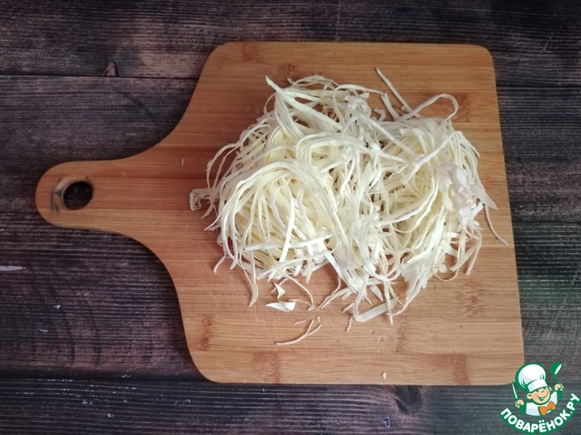 От кочана капусты белокочанной нужно отделить 5 листьев, вырезать толстые прожилки, скрутить рулетиком и очень тонко нарезать длинной соломкой. Так в салате капуста смотрится красиво.