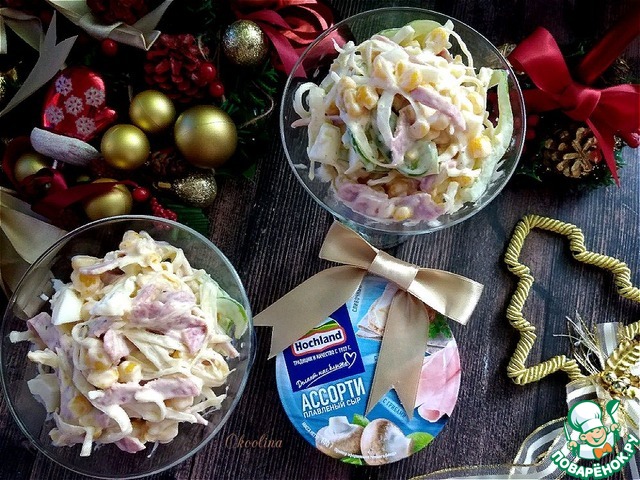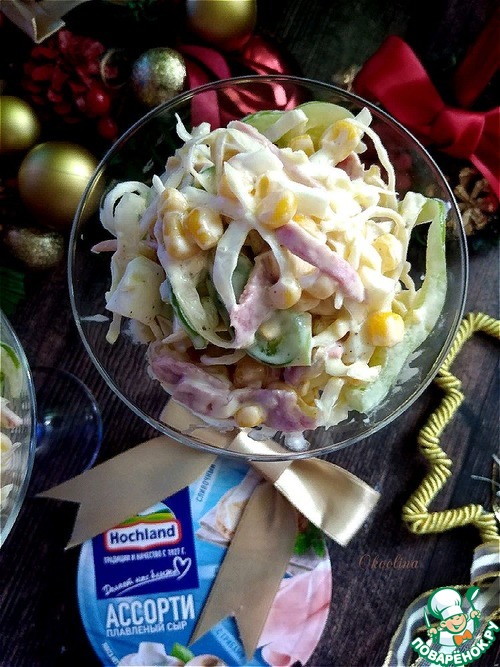 Заправляем салат. Перчим и солим по вкусу. Я не солила, мне было достаточно её от сырков и майонеза.