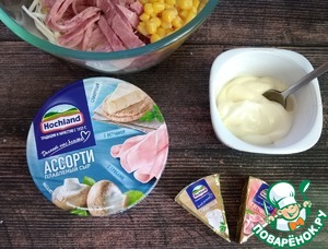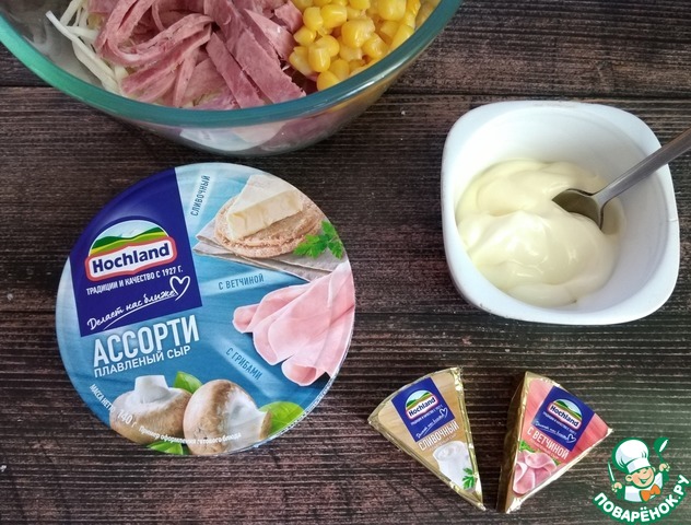 Берём глубокий салатник. Помещаем в него капусту, колбасу и перец болгарский порезанные соломкой, яйца порубленные не совсем мелко. Делаем к какой-то посуде заправку. Выкладываем майонез и растираем его с сырками Hochland в треугольниках со вкусом ветчины и сливочным. Сырки отлично разотрутся с майонезом в однородную густую массу.