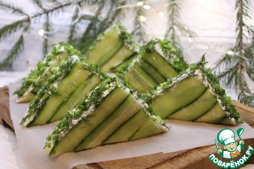 Соединить обе части так, чтобы огурцы были снаружи. Завернуть каждый бутерброд в пищевую плёнку и убрать в холодильник до подачи.