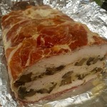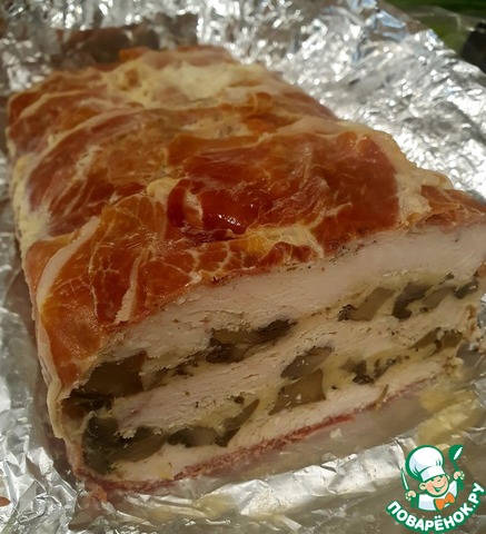 Выложите куриное филе в один слой на бекон. Затем половина начинки, снова филе и т. д. Последний слой должен быть из филе, туда же вылейте остаток яично-сметанной смеси. Накройте свисающими концами бекона. Закройте фольгой и запекайте в разогретой духовке при Т 180°С, 60 минут. Затем снимите фольгу и запекайте ещё в течение 10 - 15 минут.