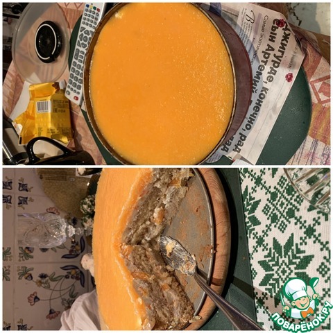 Во второй раз почему-то всё плохо застыло. И переложила сахара. Делала на домашнее чаепитие без гостей, поэтому замечательно слопали ложками, как десерт в вазочке. Правда, получилось много бисквита. Но он у меня вздулся в духовке, я просто обрезала лишнее, после чего схомячила обрезки вместо пряников
