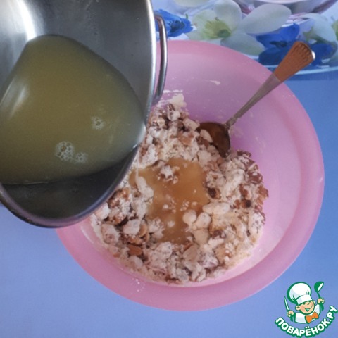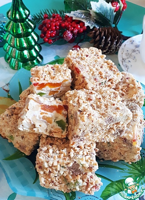 Курагу обдать кипятком и затем обсушить, грецкие орехи поджарить на сухой сковороде и крупно нарезать, арахис обжарить и удалить шелуху, цукаты нарезать.