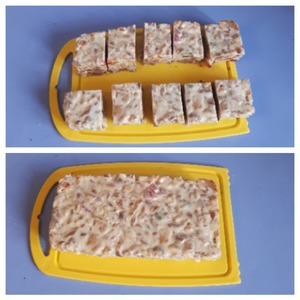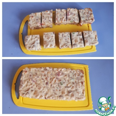 Выложить массу с силиконовую форму, утрамбовать, положить в холодильник на несколько часов для застывания. Если будите использовать другую форму, то надо ее выложить внутри пергаментом.