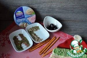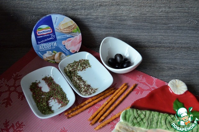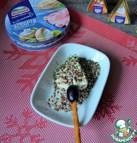 На соломку нанизать маслину, затем ломтик сыра. Ломтик сыра обвалять в смеси.