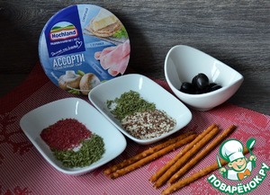 Предварительно сыр подержать в морозилке, 5-7 минут. Приготовить другие продукты. Если у Вас нет соломки, возьмите шпажки для канапе.