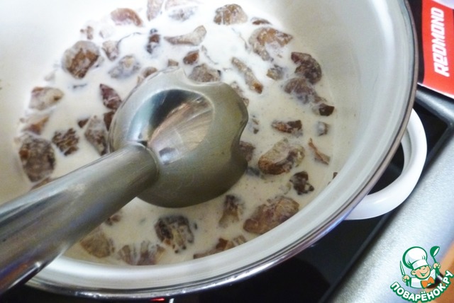 В кастрюле смешать молоко и сливки, добавить очищенные каштаны, поставить на огонь и довести до кипения, но не кипятить! Погружным блендером пюрировать каштаны в молоке, чтобы получилась гладкое пюре.