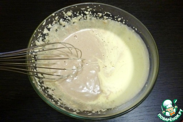 К желтково-каштановому тесту добавить растопленный шоколад с маслом, продолжая взбивать.