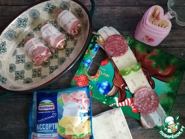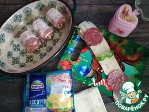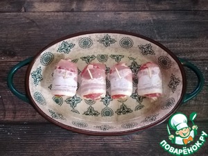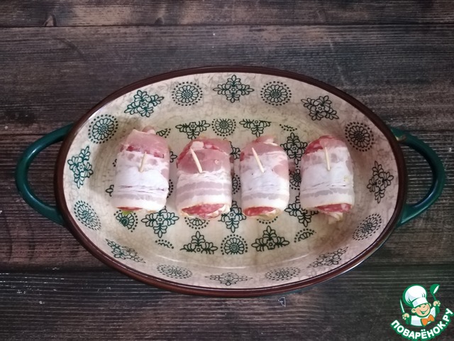 На бекон по центру выкладываем сыр, по краям салями (любую колбасу). Колбасу выкладываем так, чтобы края бекона ~1,5-2 см оставались пустыми. Заворачиваем рулетики и по центру вставляем зубочистку, прокалывая до дна посуды, куда мы их будем выкладывать. Кладём рулеты "швом" вниз.