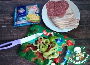 Готовим всё, что нам нужно для приготовления. Бекон и салями у меня в нарезке. Сыр я буду использовать Hochland бутербродный и возьму со скусом ветчины. Болгарский перец нарезаем поперёк половины плода, шириной ~ 1 см. -
