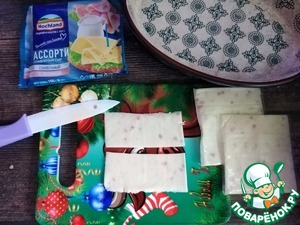 Пластинки сыра разрезаем на 2 части. Они как раз будут в ширину бекона.
