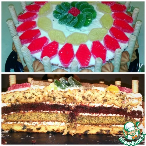 Теперь о торте. Пеку этот торт уже давно, он у меня самый любимый из самых легких. Да, долго, но совершенно не заморочно! Я пеку каждый корж отдельно в мультиварке, то есть поставила и забыла на 50 минут, занимаюсь другими делами. После остывания коржей я их разрезаю и обязательно пропитываю, т.к. на мой взгляд торт сухой! Крем сметанный, ибо масло и сгущенка жирно (ну на мой взгляд). Просто отстоянную 25% сметану смешала с сахарной пудрой и намазала. Если я заранее не приготовила торт, то готовлю этот между остальными делами))) За рецепт большое спасибо!!!