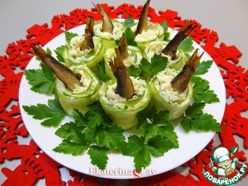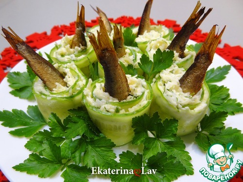 3. На каждом слайсе огурца распределяем немного сырной массы, на один край кладем рыбку и сворачиваем в трубочку. Закуску укладываем на блюдо хвостиками кверху.
