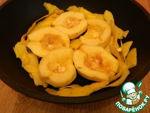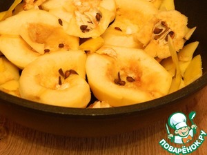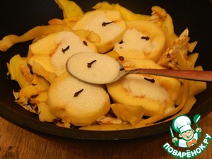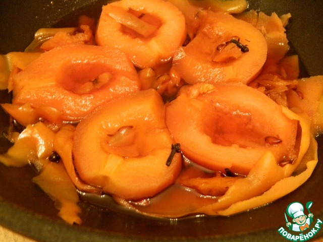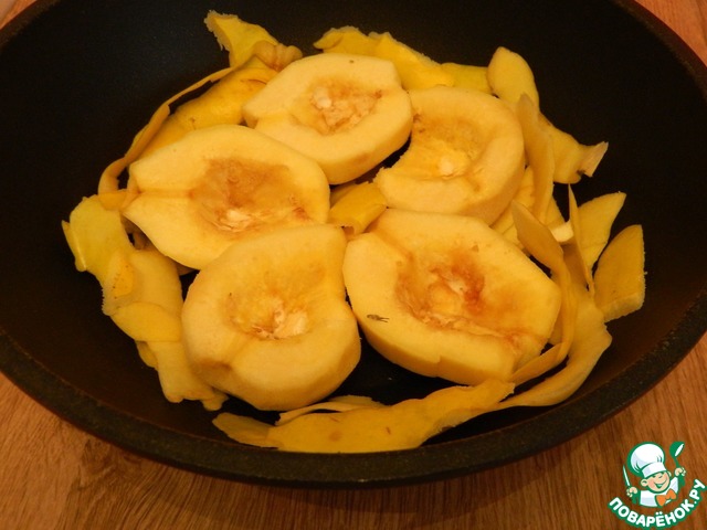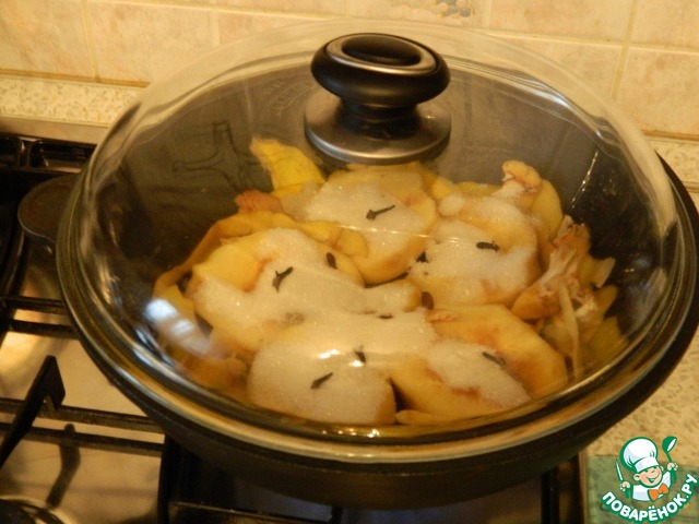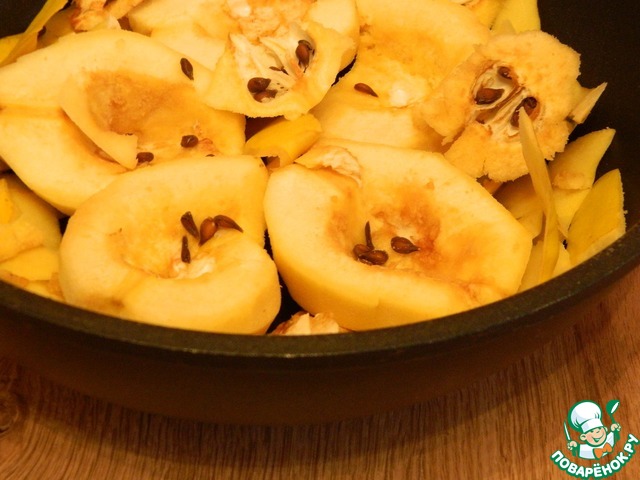 Поставим на огонь и накроем крышкой, когда закипит вода, огонь уменьшим и тушим под крышкой около 2-х часов, пока айва не станет мягкой при накалывании вилкой.