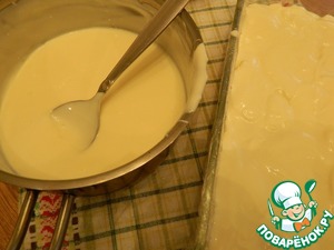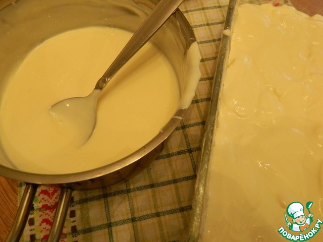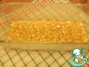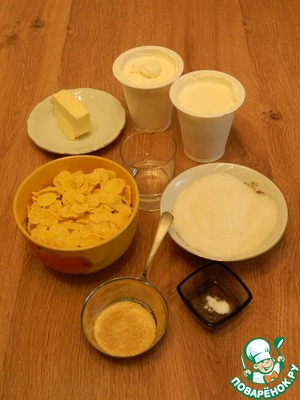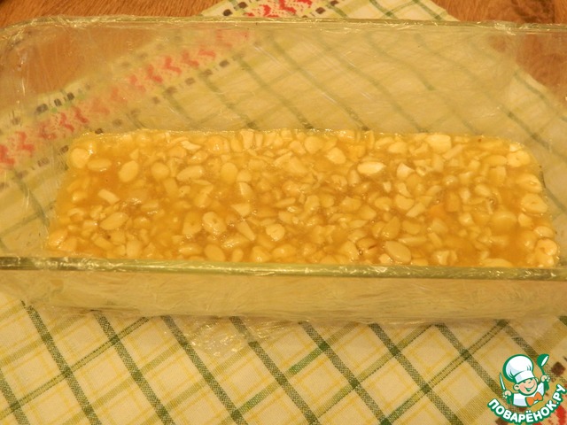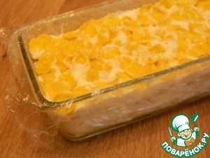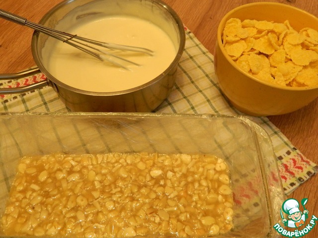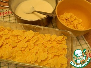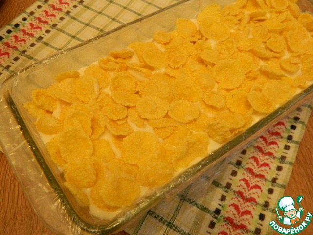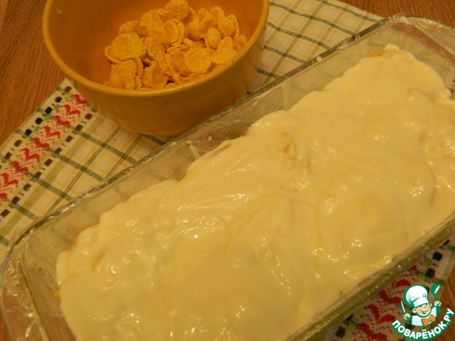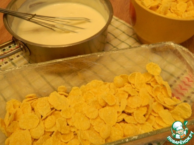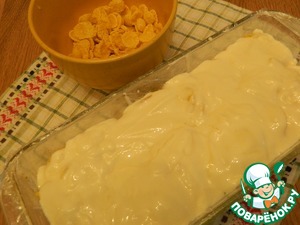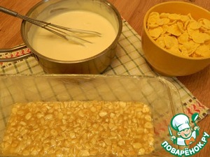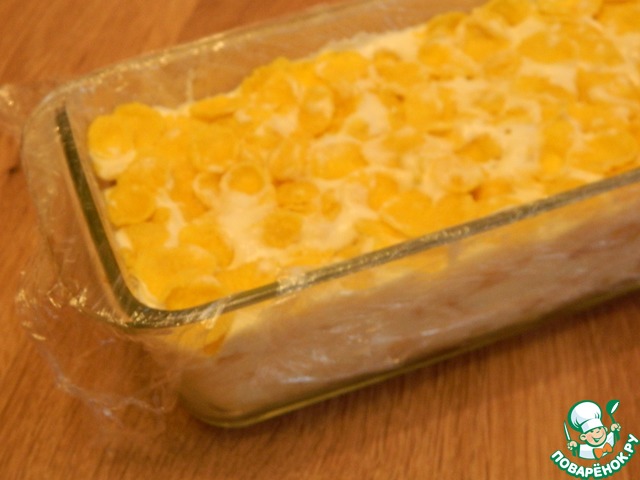 Верхним слоем снова кукурузные хлопья. Накроем форму пищевой пленкой и поставим в холодильник на ночь. У нас получится два слоя крема и три слоя кукурузных хлопьев. Нижний слой карамель с орехами.
