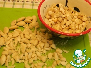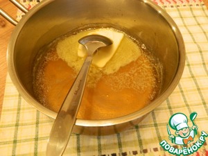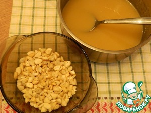 На орехи с карамелью выложим 1/3 часть кукурузных хлопьев. У меня хлопья попались очень крупные, если у Вас такие же, то предварительно лучше прокатать их скалкой, измельчить. У меня из-за крупных хлопьев в торте получились пустоты, пусть будут мельче хлопья, торт будет плотнее, ровнее и кушать удобнее будет.