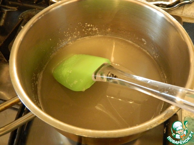 Добавим воду и и поставим на средний огонь. После добавления воды к сахару, раствор надо все время помешивать, чтобы избежать пригорания сахара. Но, как только сахар полностью раствориться, сироп мешать нельзя, нельзя опускать в него ничего лишнего, чтобы не вызвать кристаллизацию. Снимаем осторожно пенку. Огонь должен быть в одном режиме, не уменьшайте, не увеличивайте огонь, сироп должен кипеть и пузыриться. После того, как сняли пенку, если на стенках образовались где-то кристаллики сахара, накройте на пару минут кастрюлю крышкой, под действием пара с крышки стекут капли воды по стенке и смоют кристаллики.
