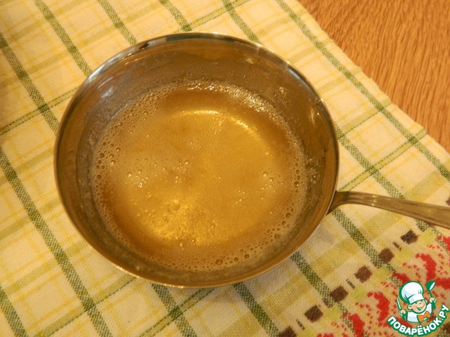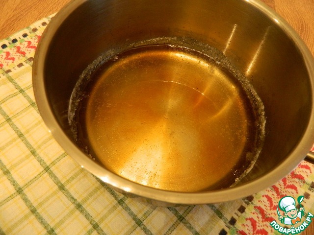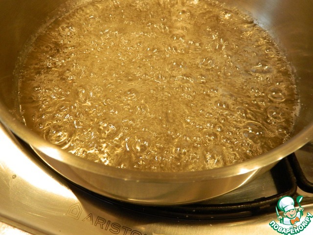Варим до янтарного цвета. Не упустите момент. Если Вы до этого не варили сироп, может не получиться, если увидели, что сахар из прозрачных пузырей, начал густеть, сразу капните несколько капель лимонного сока, избежите кристаллизации и тут же снимайте с огня, даже если сироп не стал янтарным, пусть лучше сироп будет немного жиже, чем он в момент закристаллизуется. Большую дольку лимона держите на готове. Видим, что пузыри большие. Помним об инструкции описанной выше.