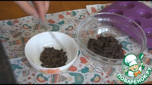 На силиконовую форму из 8 полусфер нам понадобится 1 шоколадка, 85 грамм, ещё и останется. 3/4 шоколада ломаем на кусочки или можно измельчить ножом, как вам удобно. Оставшуюся 1/4 измельчим мелко ножом и отставим пока в сторону.