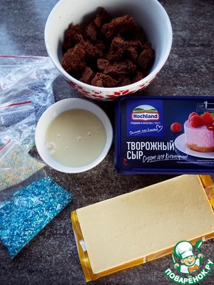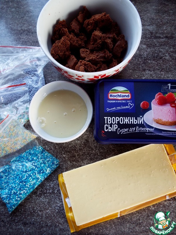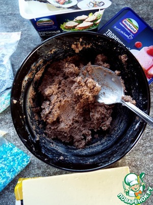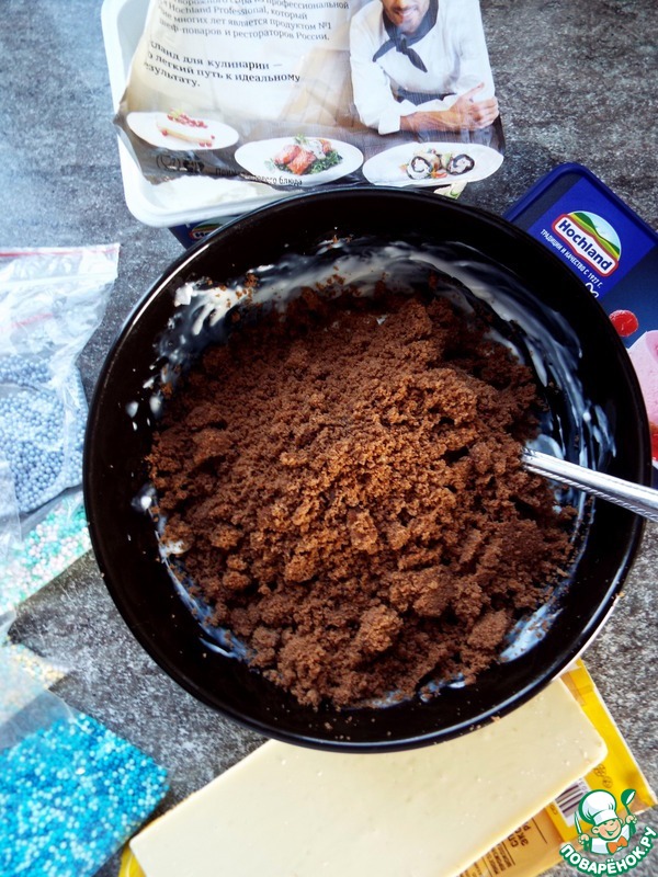 Основой для пирожных будет шоколадный бисквит. Вы можете испечь его по любому любимому рецепту. У меня остались обрезки от торта, я использовала их. Мой бисквит на молоке, с добавлением сливочного масла. Если бисквит без тяжёлых добавок, то его потребуется меньше, чем указано.