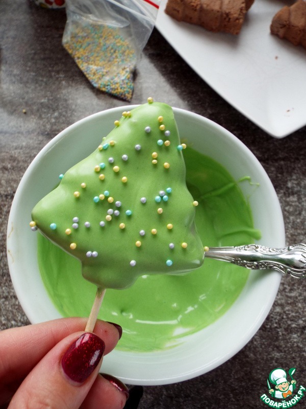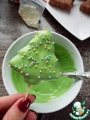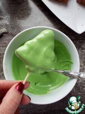 Снизу в центр ёлочки вставит шпажку, примерно до середины.