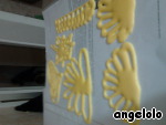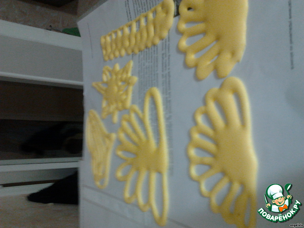 Для изготовления украшений нужно сделать рисунок желаемого изделия или взять шаблон. На этот рисунок надо положить кусочек полиэтилена или целофана, чтобы рисунок был хорошо виден. Теперь из плотного полиэтилена сворачиваем конусом мешочек с маленьким отверстием у основания. Заполняем его айсингом и приступаем к рисованию, т. е. на полиэтилене, который лежит на рисунке, выдавливаем айсинг, четко следуя линиям рисунка. После того, как Вы закончили рисунок, оставляем айсинг на полиэтилене для высыхания на 12 часов. Так как изделия из айсинга очень хрупкие, то нужно их сделать побольше. Если нужно изделию придать какую-либо форму, то сделайте какое-то приспособление, которое будет соответствовать необходимой Вам форме.