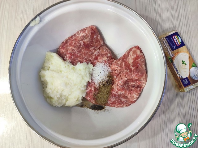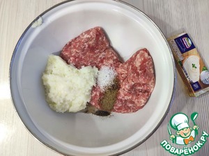 В миску добавить фарш (свинина+говядина)-350 гр., добавить соль и черный молотый перец по вкусу. Репчатый лук (1 шт.) пробить блендером или нарезать мелкими кубиками, добавить 1 ст. ложку панировочных сухарей. Фарш хорошо вымешать и хорошо отбить!