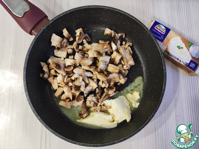 Затем шампиньоны переложить в отдельную миску, а в сковороду, где тушились грибы, добавить 100 гр. сливочного сыра ТМ "Hochland", далее добавить 150 мл. молока, огонь убавить до минимума и прокипятить смесь, помешивая, до расплавления сыра. Если останутся не большие кусочки, можно соус протереть через металлическое сито. Отрегулировать по вкусу соль и черный молотый перец.