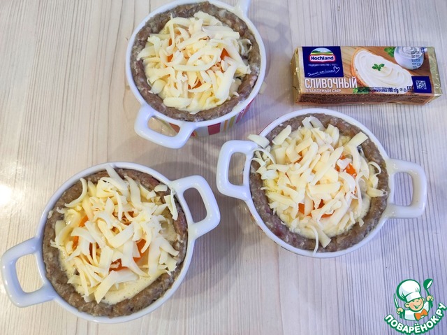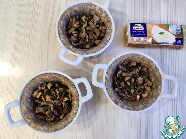 В чашечки из фарша выложить тушеные грибы, добавить приготовленный молочно-грибной соус.
